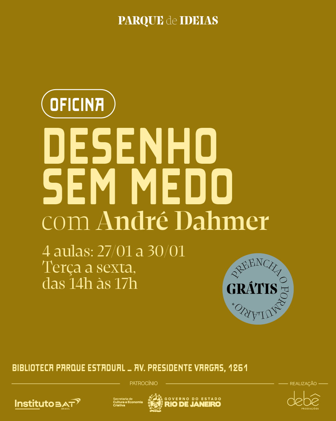 O ano de 2026 também já começa com outra oficina de grande sucesso aqui no Parque de Ideias: Desenho sem medo, com André Dahmer. Trata-se de uma oficina de desenhos para reafirmar a coragem e a confiança na prática do desenho livre. Tal qual a caligrafia, o desenho é uma expressão única e pessoal, que não oferece parâmetro de comparação ou metas, mas refúgio e passeio para quem aceita o próprio traço. Para participar da oficina, não é necessária nenhuma experiência prévia com desenho.